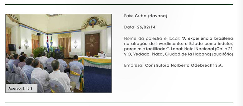 Odebrecht (8) - 02/06/2011: 200 mil dólares = R$ 314 mil - 01/07/2011 (em parceria com centro de Estudos Estratégicos de Angola): 200 mil dólares = R$ 310 mil - 01/02/2013: 200 mil dólares = R$ 396 mil - 05/06/2013: 200 mil dólares = R$ 424 mil - 15/10/2013: 200 mil dólares = R$ 434 mil - 22/10/2013: 200 mil dólares = R$ 434 mil - 26/02/2014: 200 mil dólares = R$ 470 mil - 07/05/2014: 200 mil dólares = R$ 442 mil