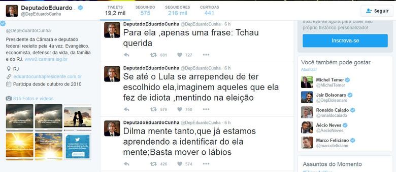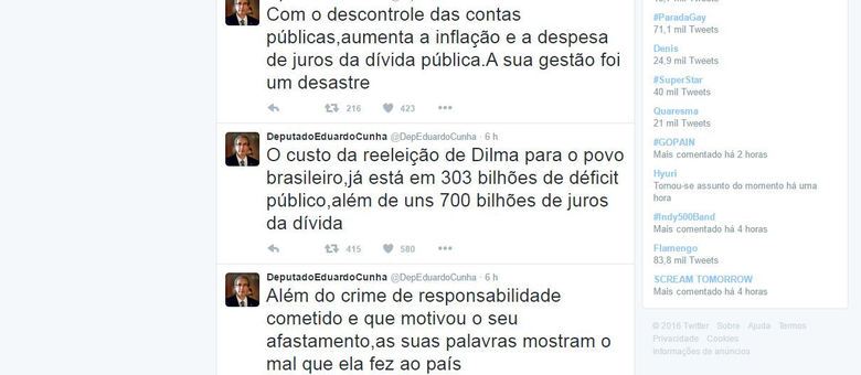 | Cunha chama Dilma de mentirosa e afirma que ela demonstra ‘incapacidade e despreparo para governar’ Posted: 29 May 2016 01:50 PM PDT Cunha finalizou sua série de publicações dizendo "tchau, querida" Antônio Cruz/16.04.2015/Agência Brasil O presidente afastado da Câmara dos Deputados, Eduardo Cunha (PMDB-RJ, usou sua conta no microblog Twitter para criticar a presidente afastada, Dilma Rousseff. Em uma série de oito postagens, Cunha disse que ela foi responsável por uma gestão desastrosa. — Além da arrogância e das mentiras habituais, ela [Dilma] demonstra a sua incapacidade e despreparo para governar [...] Além do crime de responsabilidade cometido e que motivou o seu afastamento, as suas palavras mostram o mal que ela fez ao País. Segundo peemedebista, sua manifestação por meio da rede social foi feita em resposta a entrevista concedida pela presidente afastada ao jornal Folha de S.Paulo. Na publicação, Dilma afirma que "Cunha é a pessoa central do governo Temer". Leia mais notícias de Brasil e Política No Facebook, Dilma diz que vai usar gravações em sua defesa no Senado Nas publicações, Cunha ainda acusou Dilma de ser mentirosa e de enganar a população. — Se até o Lula se arrependeu de ter escolhido ela, imaginem aqueles que ela fez de idiota, mentindo na eleição. Cunha também afirma que a reeleição da presidente custou mais de R$ 1 trilhão ao "povo brasileiro". De acordo com as contas do deputado, o valor equivale a R$ 303 bilhões do déficit público e R$ 700 bilhões de juros da dívida. — Com o descontrole das contas públicas, aumenta a inflação e a despesa de juros da dívida pública. A sua gestão foi um desastre. Na última postagem, o peemedebista se despede da presidente com "apenas uma frase": "tchau, querida". O bordão foi muito pronunciado durante a votação do impeachment da Câmara dos Deputados. Acompanhe todo o conteúdo da Rede Record no R7 Play Reprodução/Twitter Reprodução/Twitter Reprodução/Twitter |